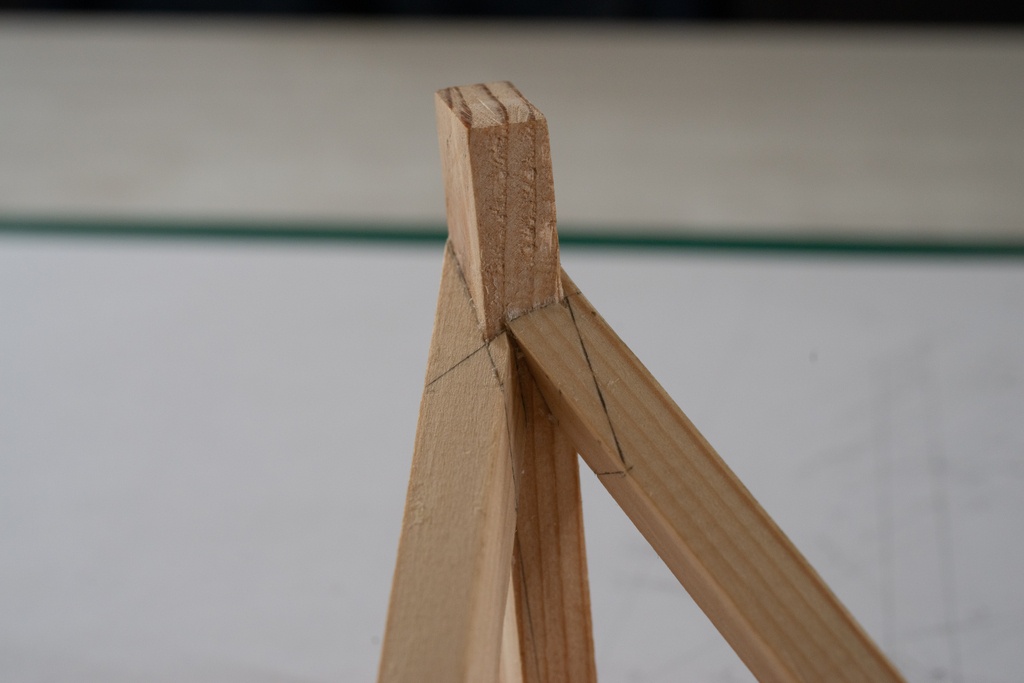 Trépied avec un croix dont les branches se font lattis entre-elles, une croix face aplomb et une croix faisant lattis au chapeau.