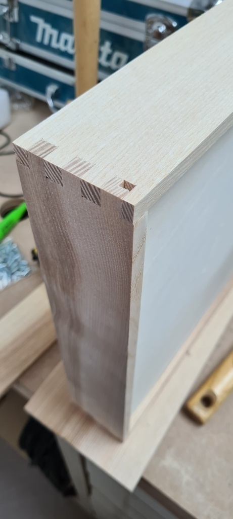 Assemblage des tiroirs avec des queues droites faites à la toupie à l'aide d'un ingénieux système de cales ayant l'épaisseur de la queue (merci Samuel).
