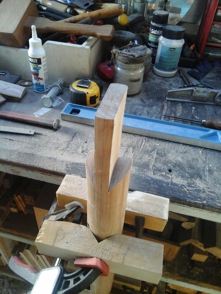 Non, sans rire, la méthode est la même que pour les tenons, taille au fur et à mesure des courbes jusqu'à ce que tout rentre bien comme il faut. J'étais pas mécontent du résultat. Je les ai quand même immobilisées avec une vis bouchonnée sur les faces inférieures. Ceinture et bretelles!