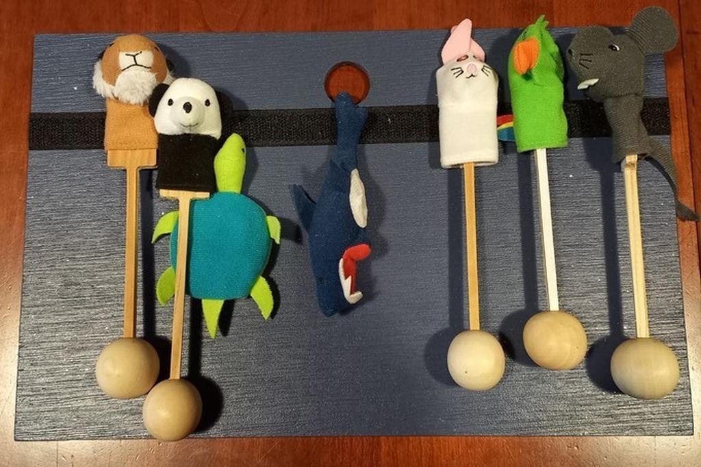 - Les marionnettes à doigt sont montées sur un bâton pour être manipulées. Le bâton est lesté pour rester accrochées éventuellement sur la scène. Elles peuvent être rangées dans la trappe sous la scène