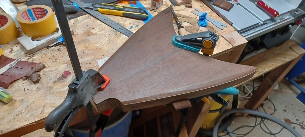 Pour la tête, j'ai collé un placage d'érable et j'ai fait une incrustation de wenge dont la forme reprend la forme des têtes de mes précédentes réalisation.