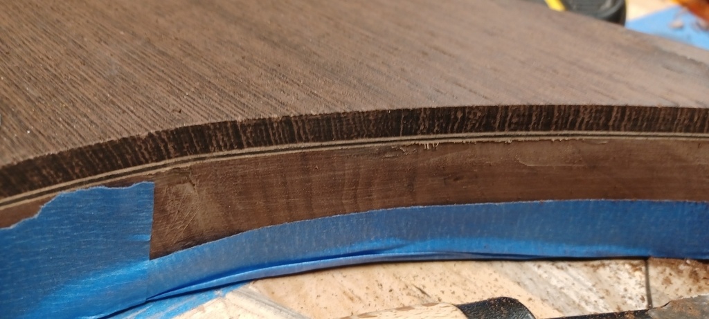 Pour créer un liserai de démarcation entre le noyer et le wenge, j'ai collé un "sandwich" avec des feuilles de placage d'érable et de tulipier teinté noir.