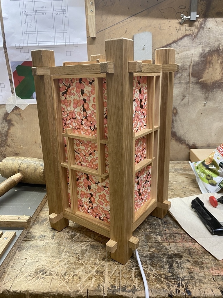 Fabrication d’une lampe d’inspiration japonaise réalisée en chêne et frêne avec un papier japonais artisanale en fibre végétal. Tous les assemblages sont réalisés à mi bois à la main. L’éclairage est assuré par un ruban led