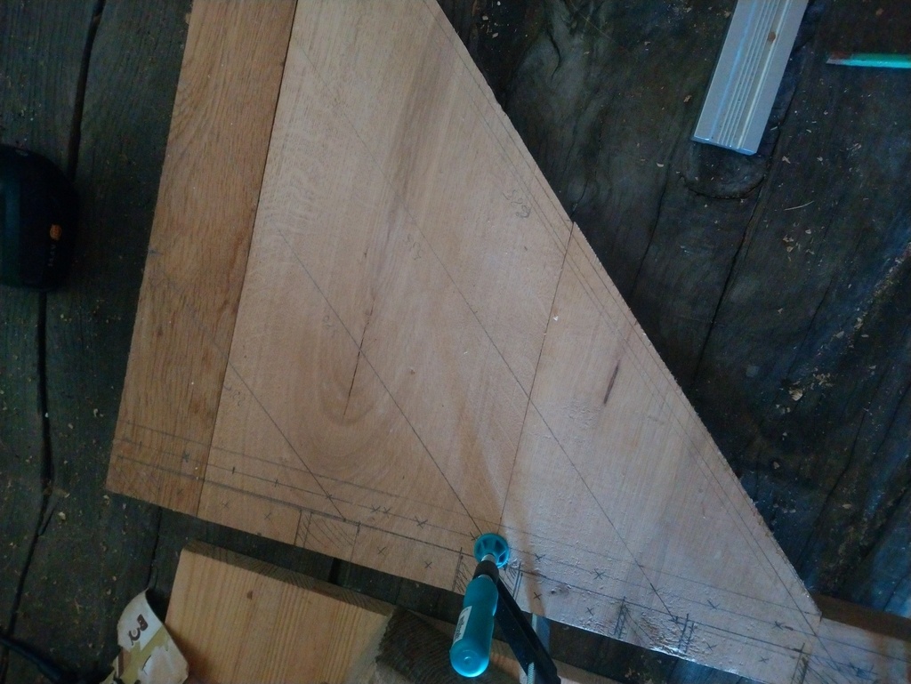 Autre contrainte, je voulais le faire en chêne et je n'en avais que sous forme de planches de 15 et 20 cm de large avec un reste de tablette pas assez grande pour faire tout le plateau ! Il y a donc un peu de Lego dans la construction.