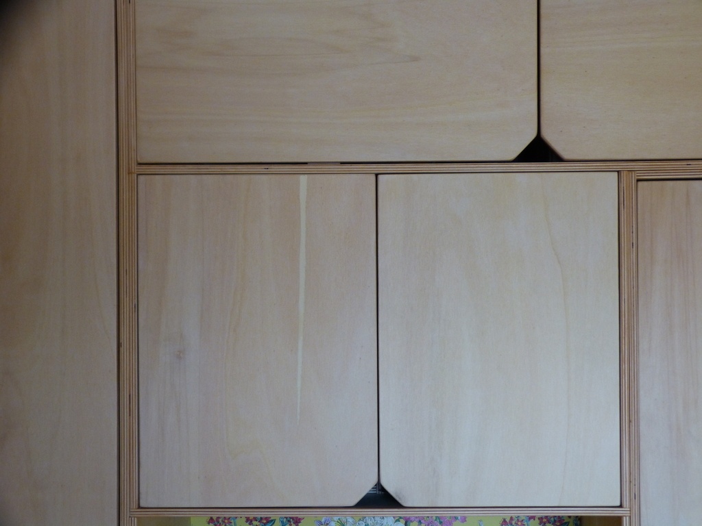 Chez mademoiselle ma fille, rangement 2m20 X 2m50 environ, constitué de 9 caissons en contreplaqué de peuplier ep 15mm, 19mm pour les portes.