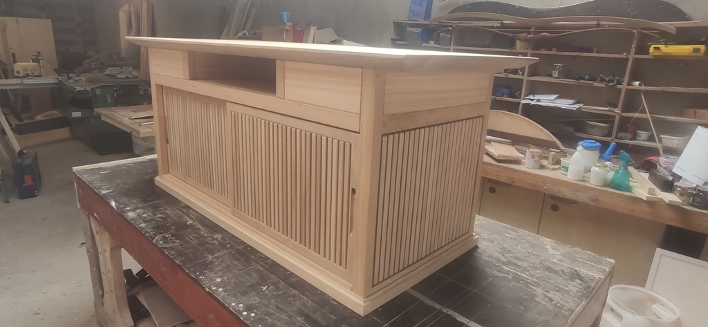 Salut Thom, pour répondre à ta question, voilà en images le montage des porte (vue de dos). Pour des raisons pratiques, les créneaux ont été réalisés dans une pièce unique délignée ensuite pour faire les traverses, idem pour les tasseaux, les feuillures ont été faites dans des pièces assez larges puis délignées. Afin d'éviter de la casse, ce n'est qu'une fois les tasseaux collés que j'ai fais la feuillure accueillant le contre profil de la traverse. J'ai tenu à laisser un espace entre les tasseaux et traverses hautes et basses afin de donner plus de légèreté à l'ensemble.