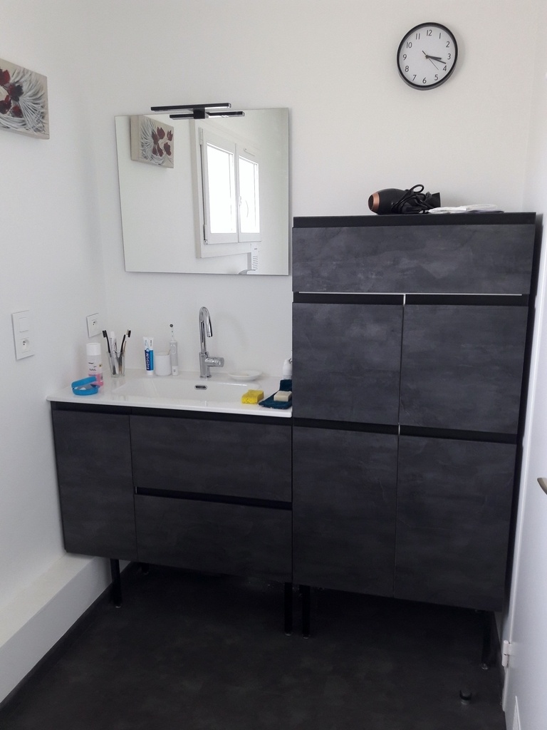 Il n'y a pas de difficulté particulière mais un piège : le plan vasque, annoncé pour 900 mm, faisait en réalité 920mm. C'est à prendre en compte lorsqu'on veut accoler un meuble un peu plus haut.