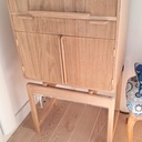 Cabinet en Chêne et Cerisier du Quercy (tout le bois vient de mon village). Corps assemblé en queues d'aronde à onglet coupées main. Piètement en faux-tenons. Les portes en Cerisier ont une âme en Chêne. Poignées en Cocobolo. Tiroir à piston en queues d'aronde borgnes et poignée sculptée. Fond en cadre et panneaux. Pivots coudés et fermoirs Brusso en laiton. Façade des portes finies au Rubio, dos et tranches au vernis au tampon. Intérieur ciré et vernis au tampon pour les panneaux du fond. Piètement et corps vernis teinté au pistolet (merci à Vincent Siebert d'Art Bois Décors). Environ 1m70 x 55 cm.