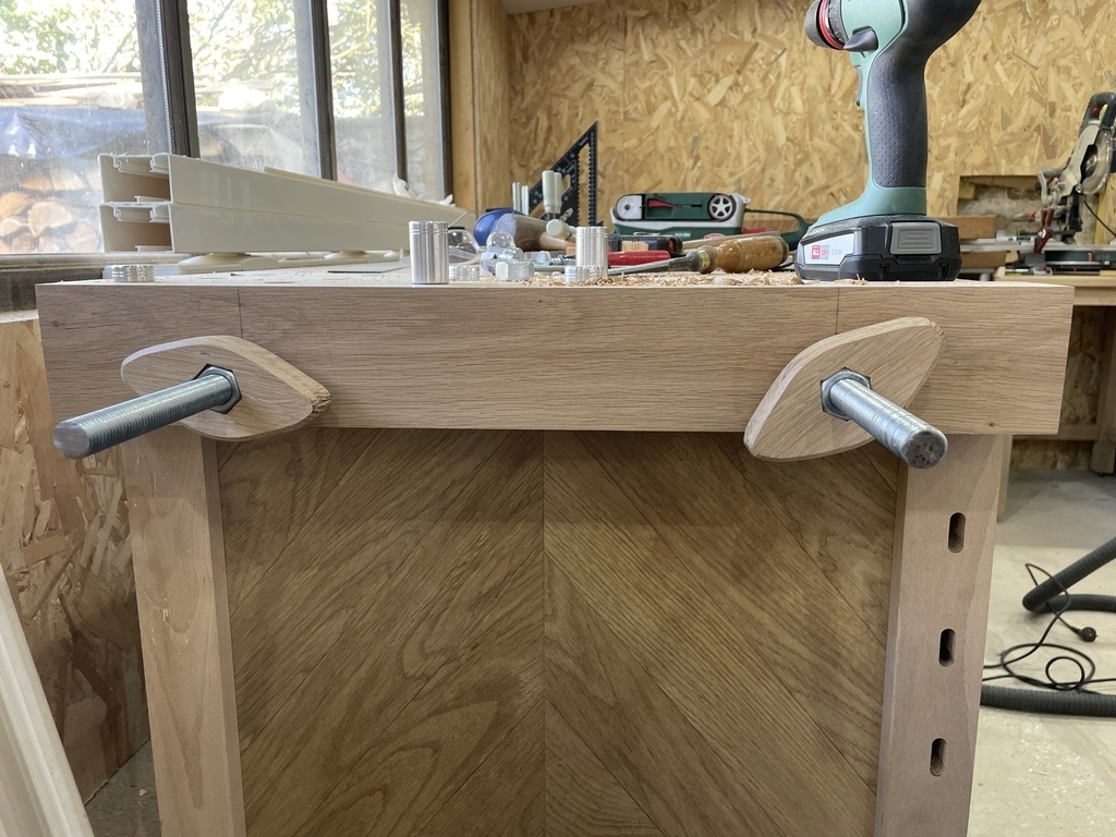 J'ai prévu une presse horizontale en bout de plateau avec des trous pour bench dog réalisé avec des chutes de tiges filetés de 18 et une joue en chêne.