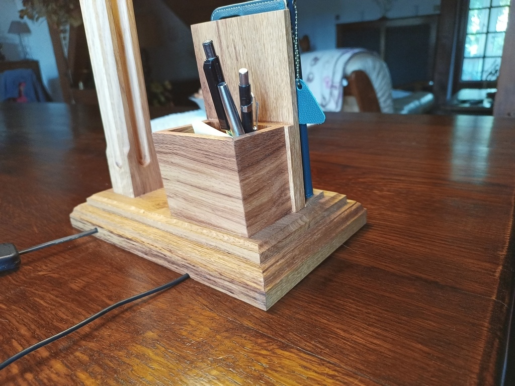 Pour ma première publication sur l'Air du bois, voici très modestement une lampe de bureau combinée à quelques rangements. Il s'agit d'un cadeau pour l'anniversaire de mon père, fabriqué l'été dernier en deux jours, avec quelques chutes de chêne pour la plupart déjà corroyées. Je n'ai pas de photos montrant les étapes de la réalisation (je n'y ai pas pensé et j'étais contraint par le temps), aussi j'espère que vous ne m'en tiendrez pas rigueur.
