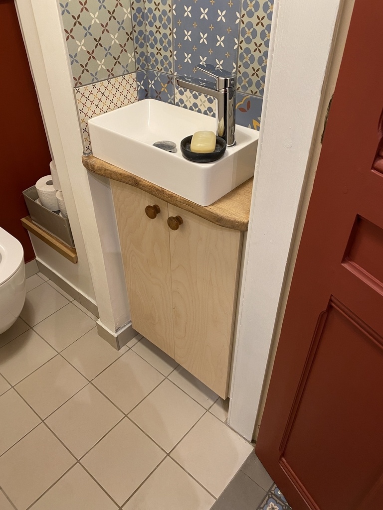 Parfois on prend le temps de dessiner des plans sur sketchup, faire des assemblages compliqués, tester de nouvelles techniques... Et parfois il faut faire vite et efficace. Je me suis retrouvé dans cette seconde situation pour finir ces toilettes qui étaient en travaux depuis plusieurs mois. voici le processus :