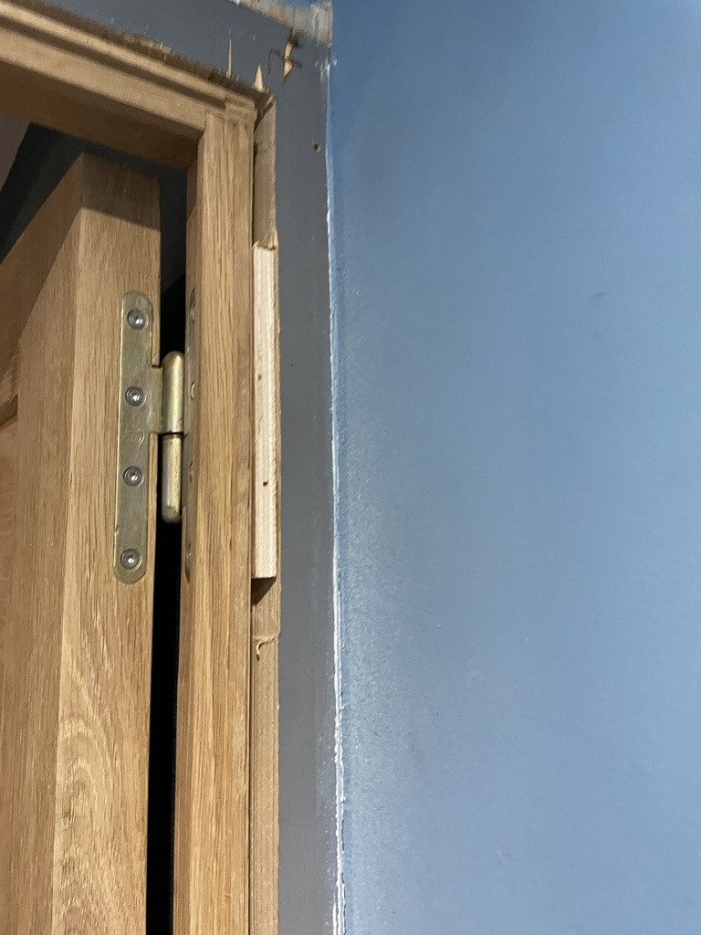 Enfin Recouvrement de la face opposée de l’encadrement par du champ plat mouluré pour permettre le dégondage de la porte côté ouvrant .