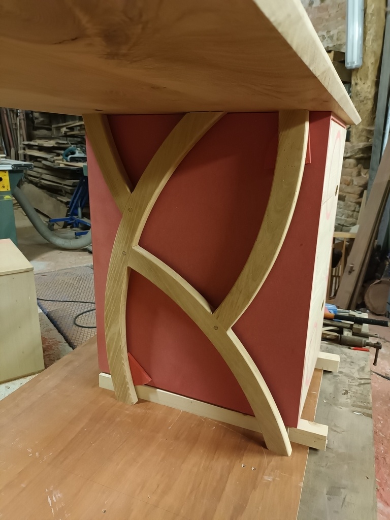 Puis ensuite plusieurs possibilités : est-ce que je fixe le caisson sur les pieds courbes ? Est-ce que je le mets sur cale mais sans le fixer au reste du bureau ? Est-ce que je le mets sur cale avec des guides sous le plateau pour le centrer sans le fixer au bureau ?... Bref je me suis beaucoup posé de question à ce sujet. Finalement il est sur cale avec guide sous le bureau.