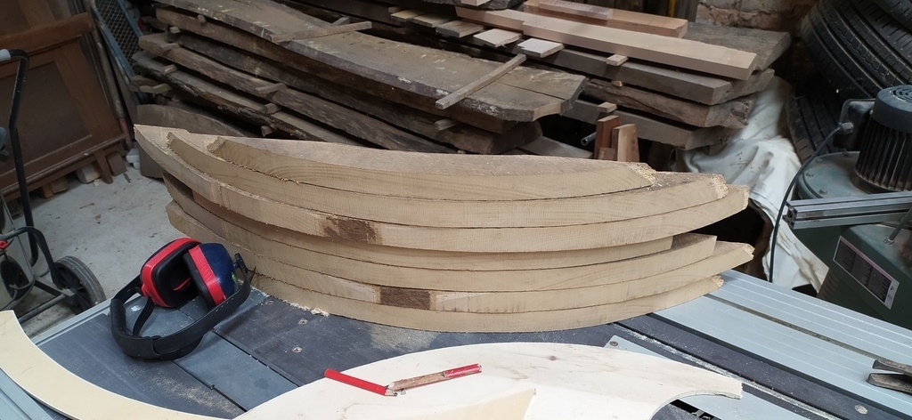 Pour la partie piètement, découpe d'un gabarit en CP de 7mm. Traçage des divers pièces sur le plateau brute. Découpe à la scie à ruban suivi du corroyage puis passage à la toupie au calibreur.