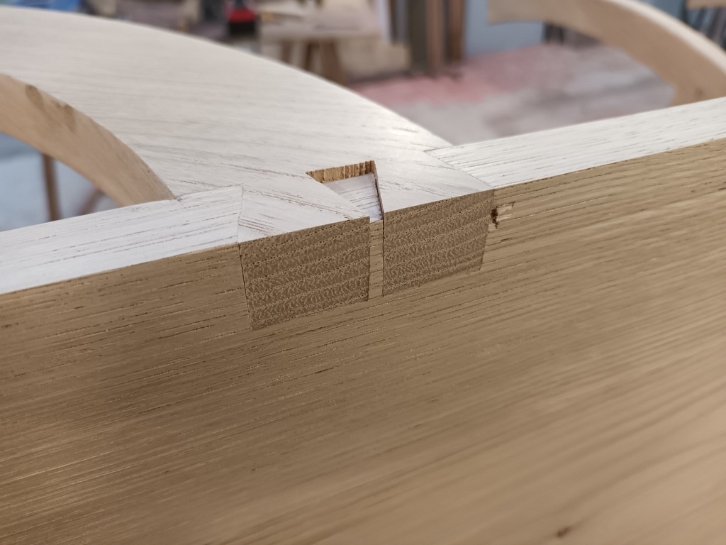 Une dernière chose sur l'assemblage, j'ai également fait un renfort pour la partie à 90°, par peur que ça casse avec les aléas de la vie (déménager le bureau de place, chamaillerie entre les enfants....) Renfort fait en queue d'aronde (Oui on y prend gout avec cette superbe technique), mais au moment de l'emmanchement (peut-être un peu trop serré) la partie du milieu s'est compressée, du coup il y a un vide...