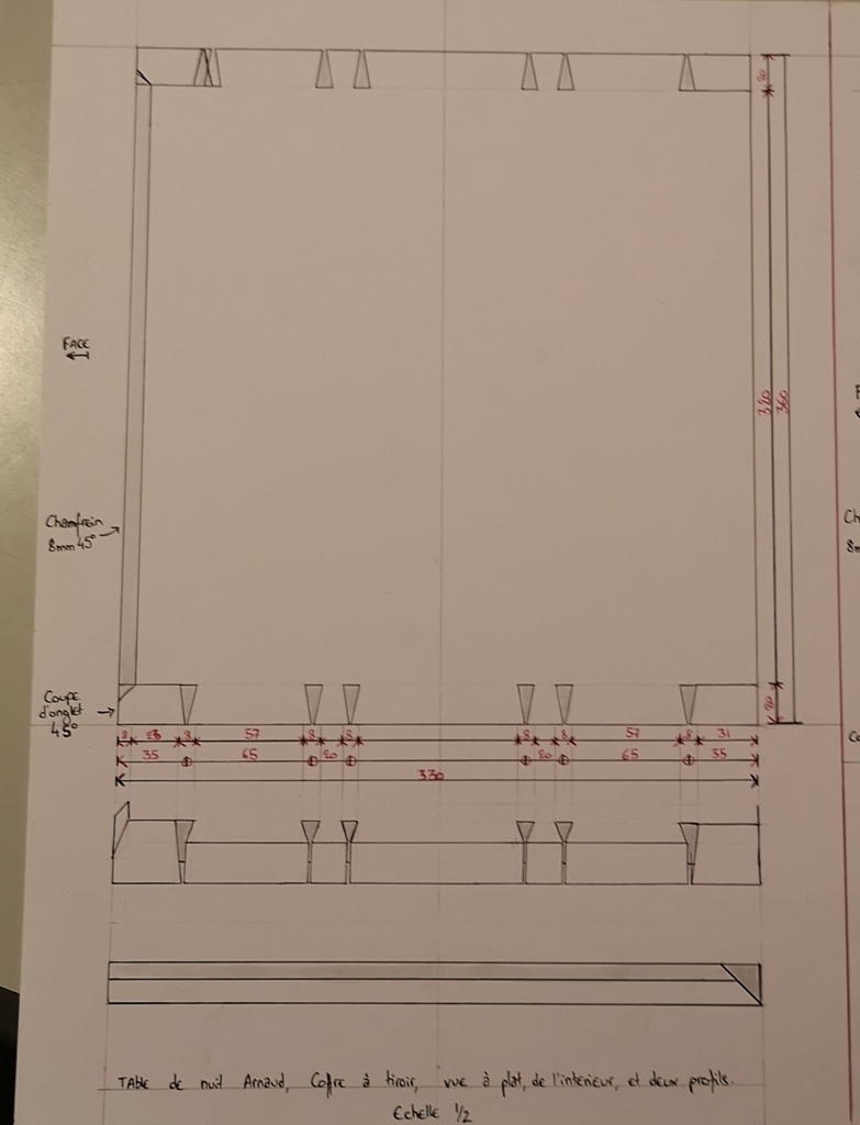 Le coffre à tiroir en cerisier est assemblé par des queues d'arondes (mes toutes premières). J'avais fait quelques heures d'entrainement avant de me lancer. Quand j'eu été assez content de mes résultats je me suis lancé sur les vraies.