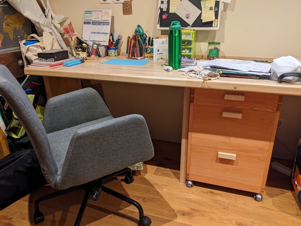 Notre espace bureau est un coin sous pente avec un long et profond plan de travail, avec aucun rangements (je vous explique pas le bazar !).
