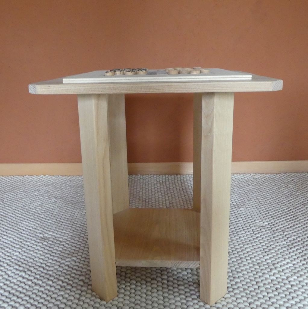 J'ai réalisé cette petite table il y a quelques temps afin de pouvoir lire ou jouer dans notre coin bibliothèque. Elle est en frêne massif. C'était l'une des premières fois que je réalisais moi-même les plateaux à plat joint avec des lamellos. L'ensemble est également fixé avec des lamellos.