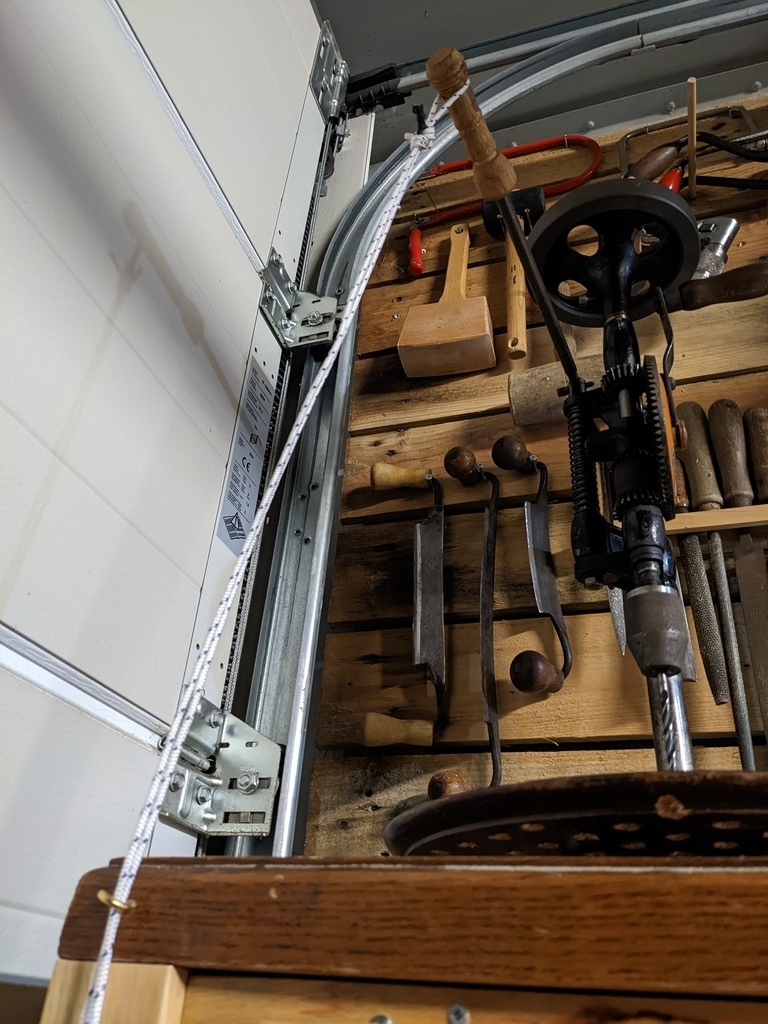 J'ai commencer par estimer la longueur d'axe nécessaire pour la descente totale du mandrin, j'ai façonné à la va-vite une petite pédale relié à l'aide d'une cordelette au levier de la perceuse. Cordelette guidé via de petits crochets.