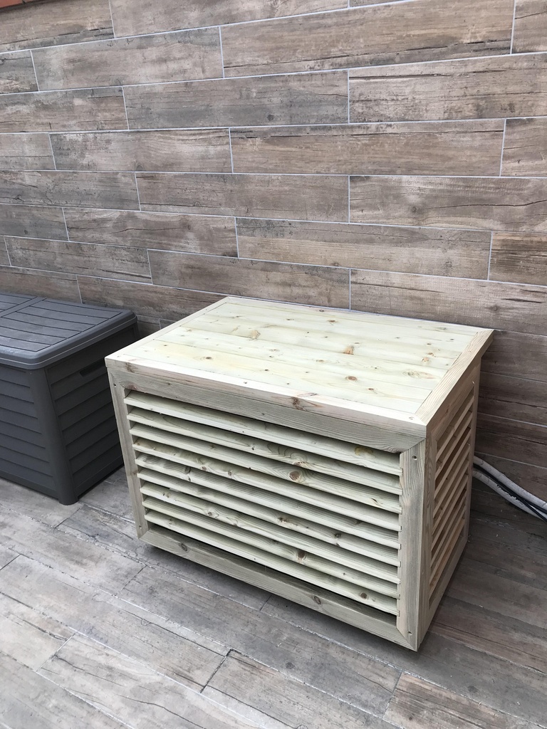 Cache bloc externe de pompe à chaleur réalisé à partir de lambourdes de terrasse en pin classe 4 et des lames de bardage exterieur.