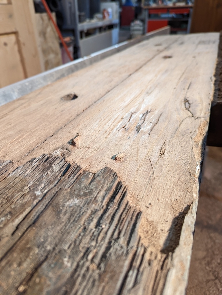 J'ai parlé dans un autre post d'un ancien linteau en chêne dont j'ai tiré une guitare ; il m'a aussi permis de refabriquer un pied, des traverses, des pièces diverses (bas de pieds, morceaux du plateau, chevilles, rives, plateau inférieur, etc).