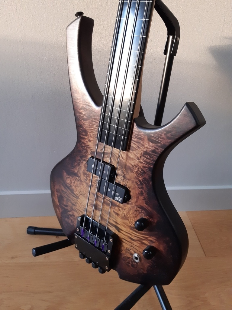 Ma première basse, réalisée pendant le COVID. Corps en Okoumé, table en érable "burl", touche ébène, fretless, headless, passive, micros Précision Aguilar. Teintes et huile de chez Crimson Guitars
