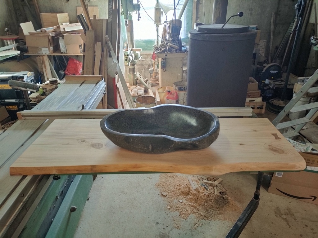 cedre pour le plateau du haut, qui est un assemblage de 2 morceaux, et platane pour le porte serviette en dessous.