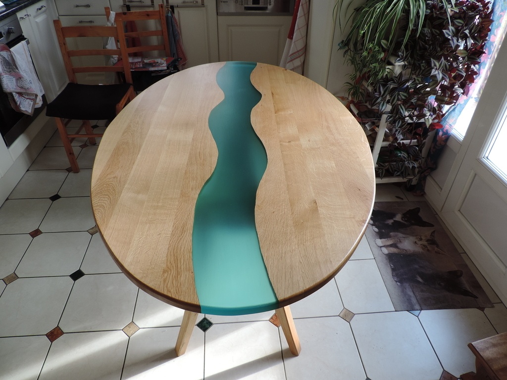 Peu de pièces dans ce projet, mais pas mal de boulot, le résultat me semble pas trop mal en tout cas il plait à la cliente. J’aurais aimé un peu plus de transparence de la résine, il aurait fallu pour cela passé du polish, mais j’ai eu peur des remontées tanique sur le chêne