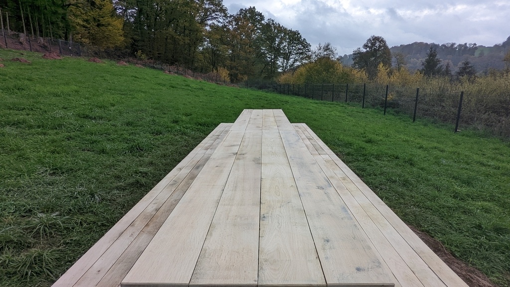 Une table toute simple mais massive. Réalisée à partir de traverses paysagères en chêne 200 x 100 sur une structure en acier thermolaquée. Les pièces sont assemblées par des tiges filetées inox d.16 avec des rondelles entre chaque pièces pour permettre la circulation de l'air.