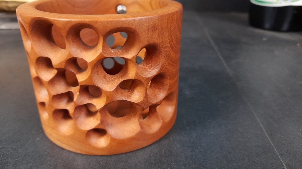 Voici un petit pot à crayon réalisé l'an passé ou j'ai utilisé un petit foret puis un foret étagé pour prépercer des trous au hasard de diametre different de chaque côté puis découpe de fines bandelettes de papier à poncer en commençant par le grain 80 puis 120, 180 249, 320 et enfin finition à l'huile de tung et voilà un petit pot assez long à réaliser (beaucoup de ponçage) pour un chouette résultat je trouve.