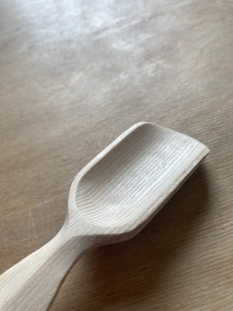 C'est toujours un plaisir de faire des copeaux au couteau. J'ai tenté une nouvelle forme de manche sur la cuillère en frêne.