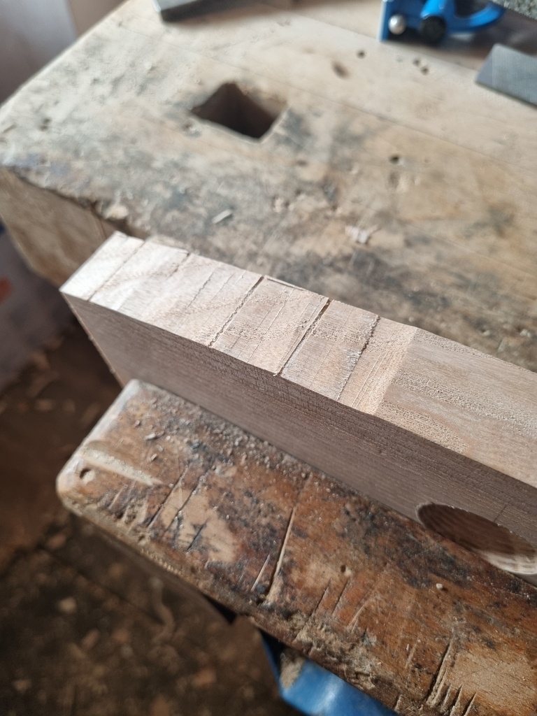 Après un léger affûtage de la lame, j'ai pu faire un premier test sur un reste de hêtre. L'outil s'utilise très bien. Pour des profondeurs assez conséquentes il sera peut-être difficile de bien voir le bout de la lame, à voir à l'usage. Des copeaux gênent parfois la vue en restant bloqués entre la lame et le chanfrein sur le dessous, je pense agrandir celui-ci pour libérer les copeaux plus facilement.