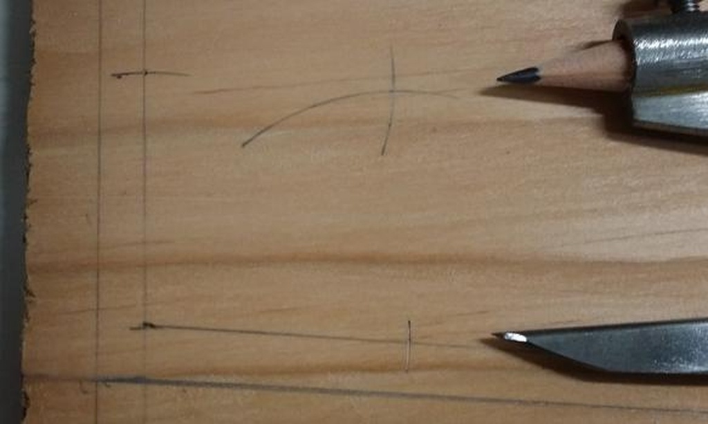 Il suffit maintenant de tracer une droite entre l'intersection de ces deux nouveaux arcs et l'angle, pour séparer cet angle exactement en deux. Je pourrai ensuite placer une fausse équerre sur ce tracé, pour effectuer la coupe des côtés.