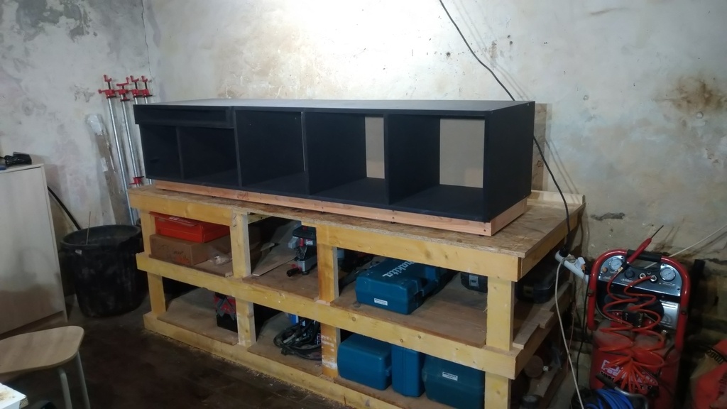 - Découpe et assemblage (lamello et vis d'assemblage) du caisson en MDF noir qui sera ensuite vernis