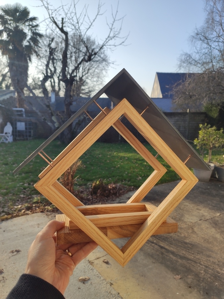 Fabrication de la structure à partir d'un tasseau de chêne de 17*17mm, et utilisation d'une chute d'un plateau de chêne lamellé collé de 18mm pour la base.