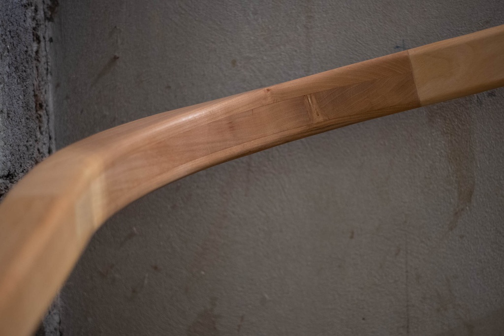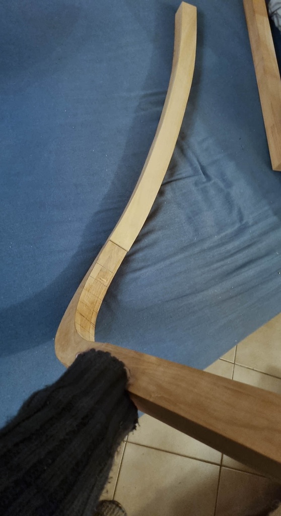Les arrondis du virage ont été fini en place, j'ai fait une simple coupe d'aplomb aux extrémités, poncé à la main et passé une couche de gomme laque.
