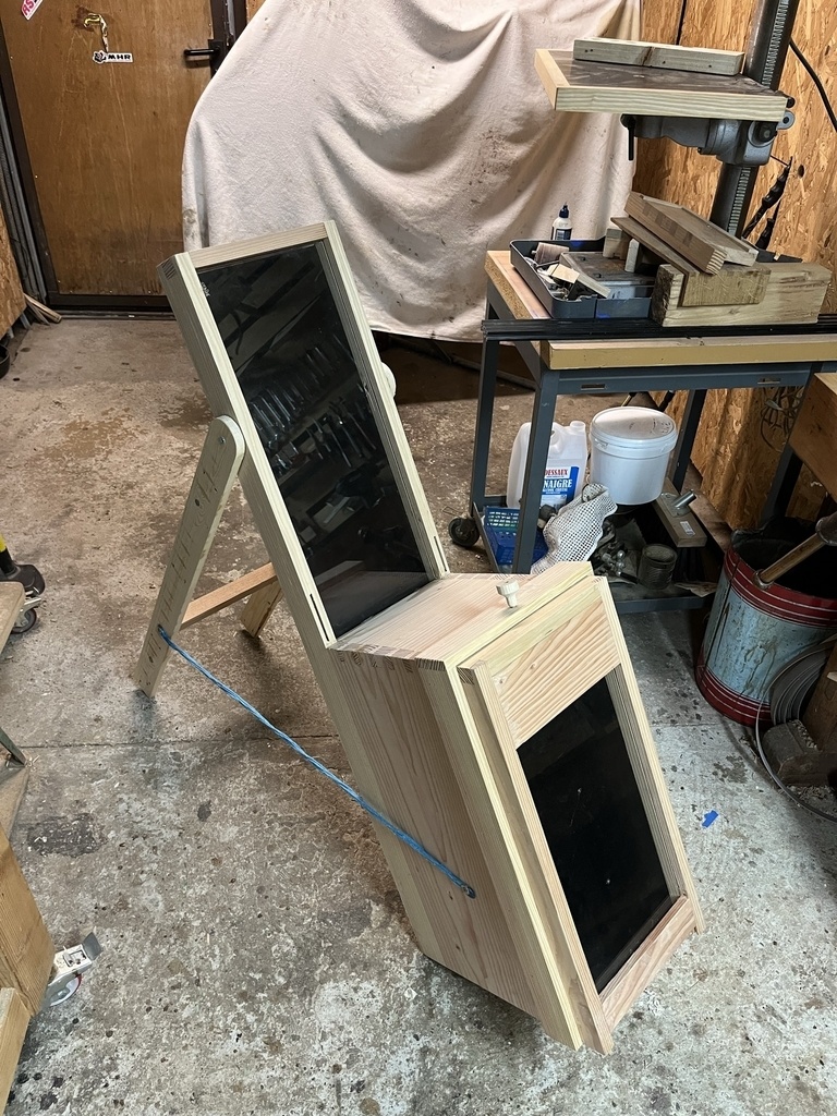 Hello. Je vous présente un séchoir à fruits, solaire confectionné cet hiver. Il est en Douglas. L’inspiration me viens d’une vidéo sur le net je n’ai plus le lien. J’ai tenté de le reproduire sans cotte, et il semblerai que il fonctionne bien ( teste cette semaine).