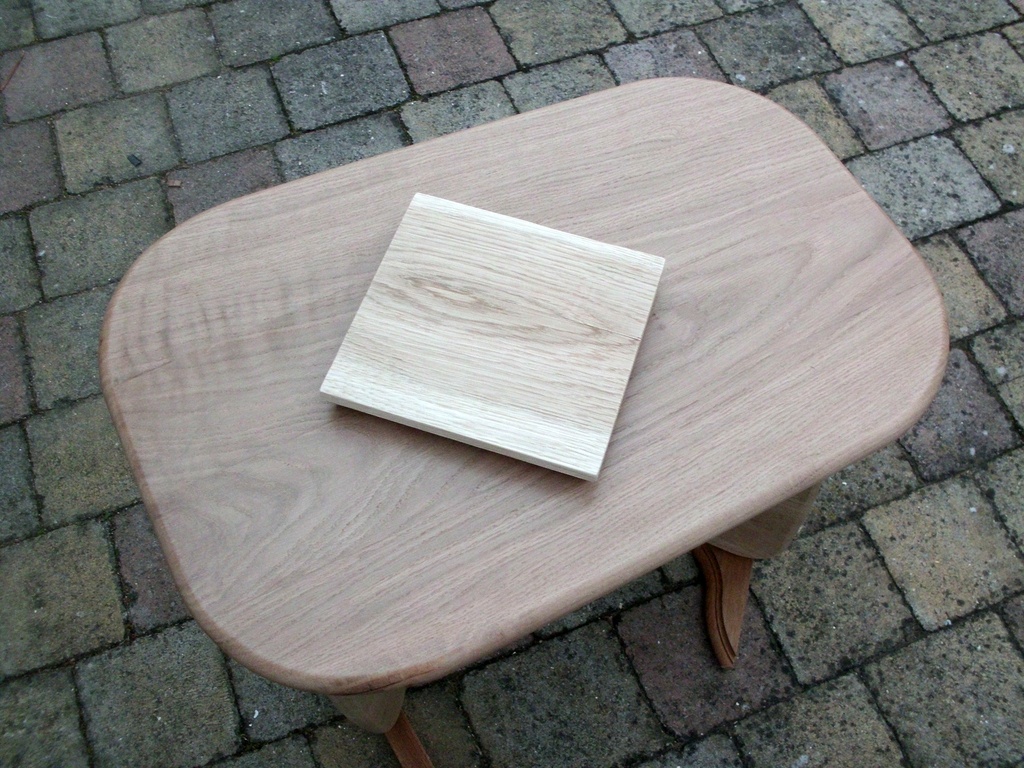 Dont acte, c'est parti pour la découpe des pieds dans du chêne grâce au gabarit pour le bouffe-tout, et pour le plateau, d'une forme triangulaire au départ ce sera un rectangle pour éviter de perdre trop de surface.