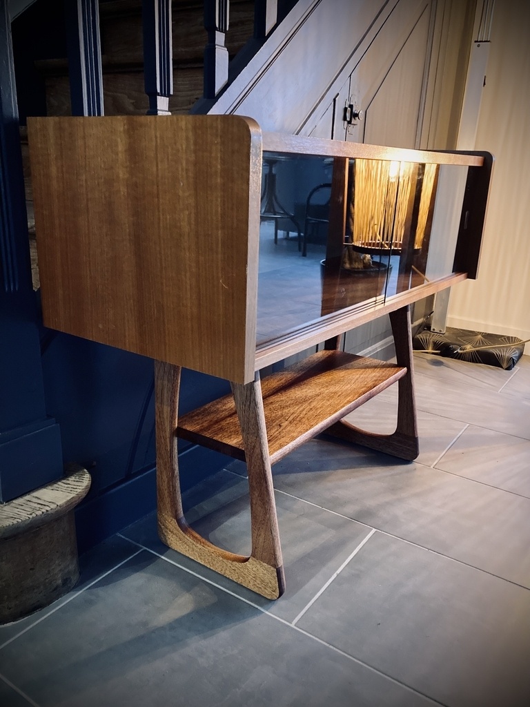 Ma compagne a eu l'idée de couper et ne garder que la vitrine du secrétaire (la partie du haut), et m'a demandé de faire les pieds. Ça a été un bon exercice avant de passer à la bibliothèque mid-century qui avait ce même type de pieds. Ils sont grandement inspirés de la chaise traineau Baumann des années 80. Un gabarit, une fraise à copier et le tour est joué !