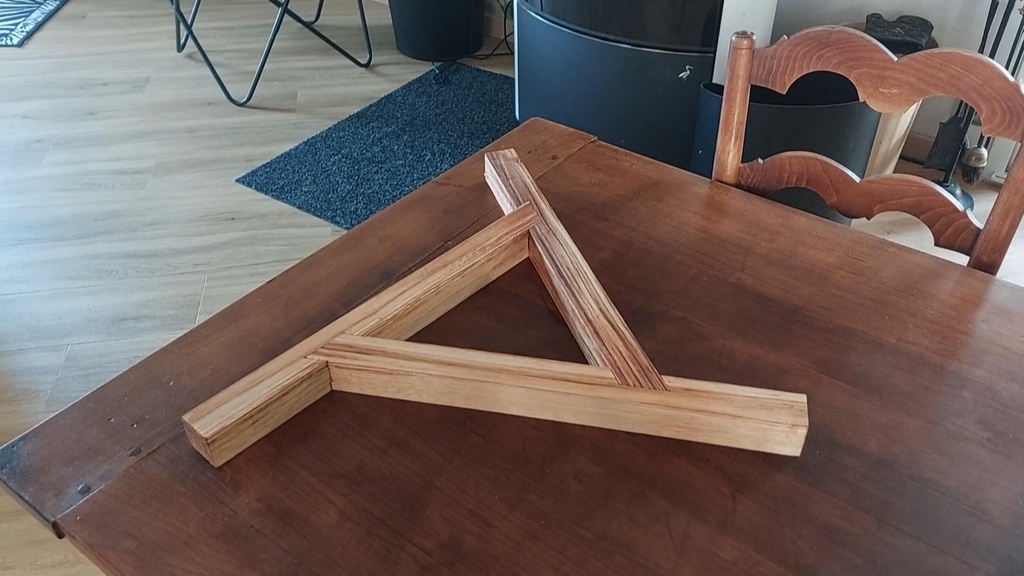 Présentation d'un assemblage japonais à 3 branches réalisé à partir de carrelets de Châtaignier. l'emboitement nécessite une avancée synchrone des 3 bras pour pouvoir se faire. On doit laisser un tout petit jeu, sinon ça devient un assemblage impossible.