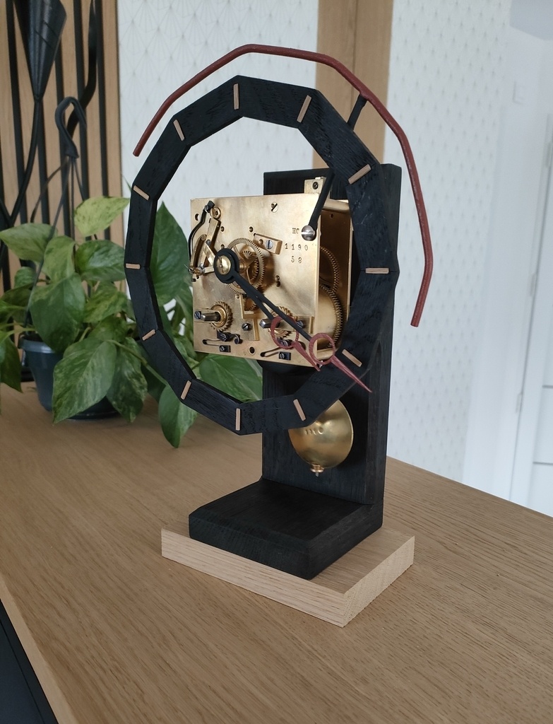 Support et cadran dodécagone en chêne teinté noir style ébonisation (littlefair's: interior wood Dye Black Ebony) puis verni. Teinte facile a appliquer et rendu top je trouve, plus facile que l'ébonisation (que j'ai déjà testé) pour un rendu similaire, le veinage du bois ressort bien. La donneuse d'organe a elle reçu un mouvement Quartz.