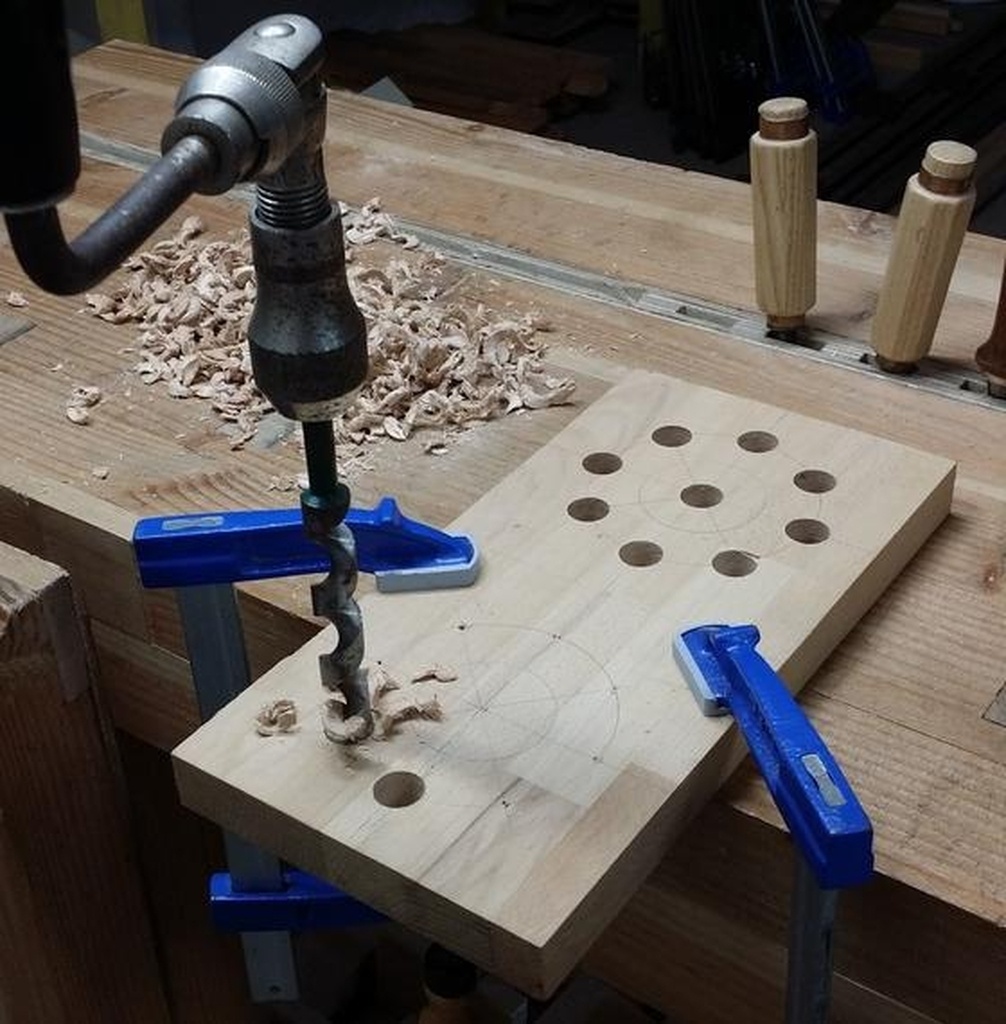 En effet, la mèche de vilebrequin de 18 mm possède une vis assez imposante et le risque d'éclater le hêtre (bois très nerveux) est important.