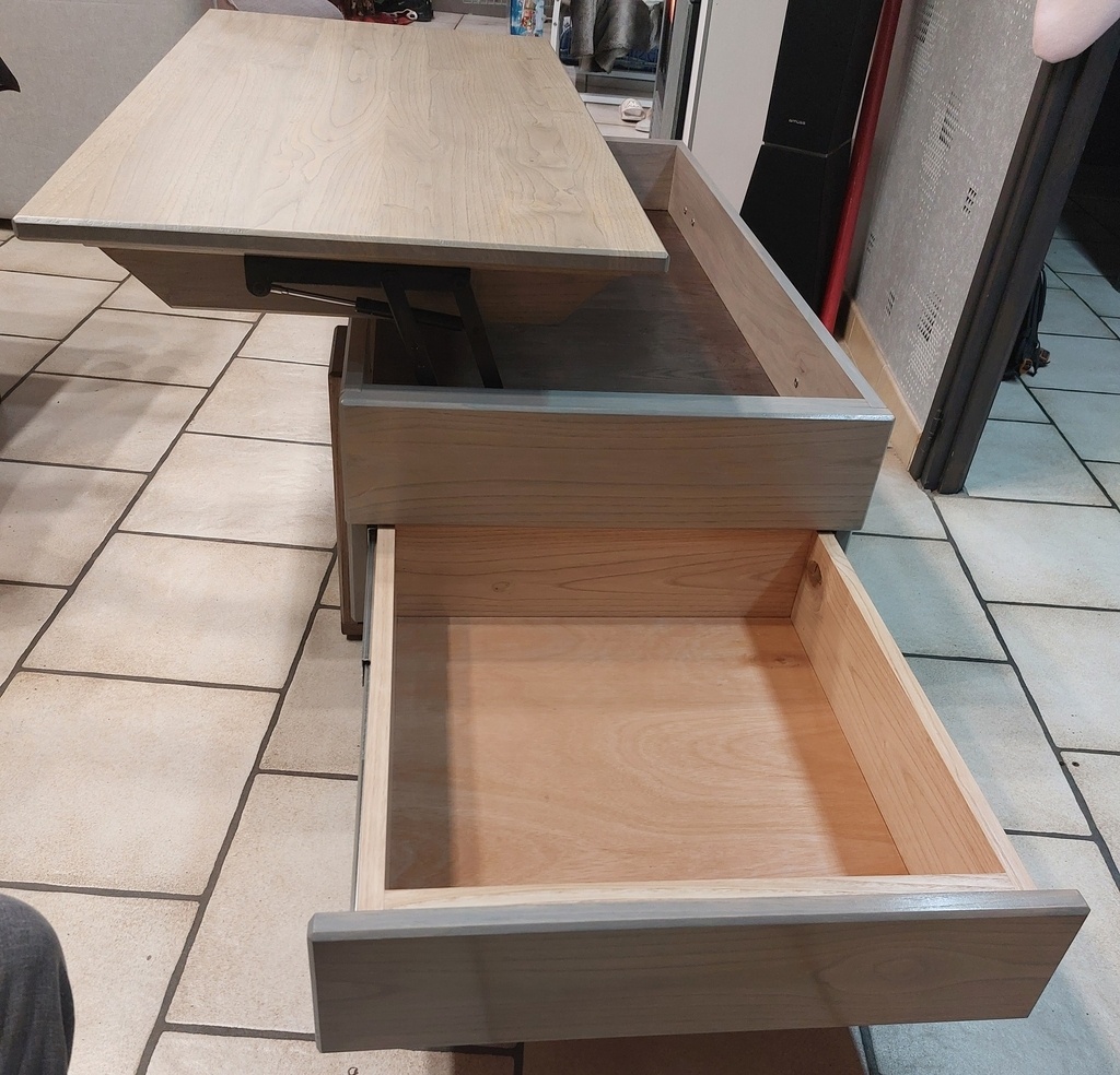 Je n'ai malheureusement pas pris beaucoup de photos de la fabrication, juste les tiroirs et le collage du plateau mais si tu veux une photo sous un angle particulier pas de problème.