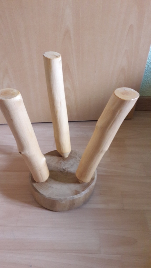 Un tabouret pour enfant fait d'une tranche de chêne pour l'assise, et d'aulne pour les pieds. Les pieds sont insérés dans l'assise par des tenons ronds. Cire en finition. Ça fait un peu mal aux fesses, confort à revoir... Je me demande encore pourquoi l'assise ne s'est pas fendue au séchage.