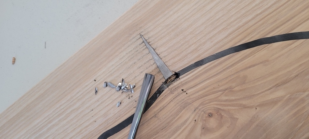 Garde corps en frêne massif. Très bon exercice pour travailler avec des angles. Les assemblages ont été réalisé avec la domino et ses divers accessoires pour la rapidité. Le tracé de la chaîne des puys tel que vue de la fenêtre du client est agrémenté de ses initiales, réalisé à la Shaper puis rempli avec de la Sika pour carrosserie noire (elle se ponce très bien et offre une finition vraiment sublime). La pointe du Puy-de-Dôme a été coulée dans le bois avec de l'étain. C'était une 1ère et j'en retiens qu'il faut bien creuser le bois pour laisser de la marge au ponçage et rattraper toutes les marques indésirables de brûlure entre autre. J'ai poncé au 320 pour avoir un effet semblable à l'aluminium brossé c'est vraiment sympa.