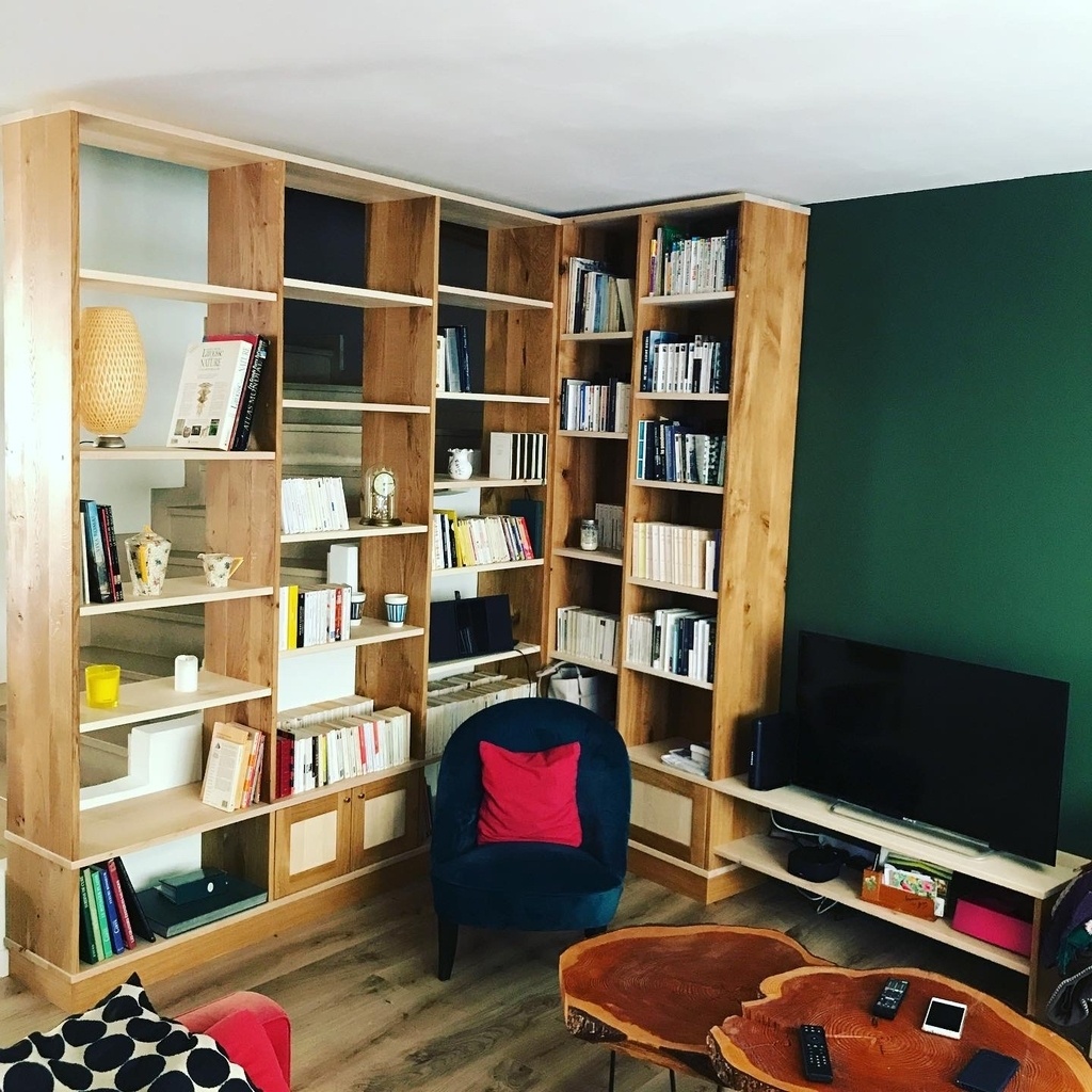 20 mètres linéaires de rangement dans cette bibliothèque d’angle.