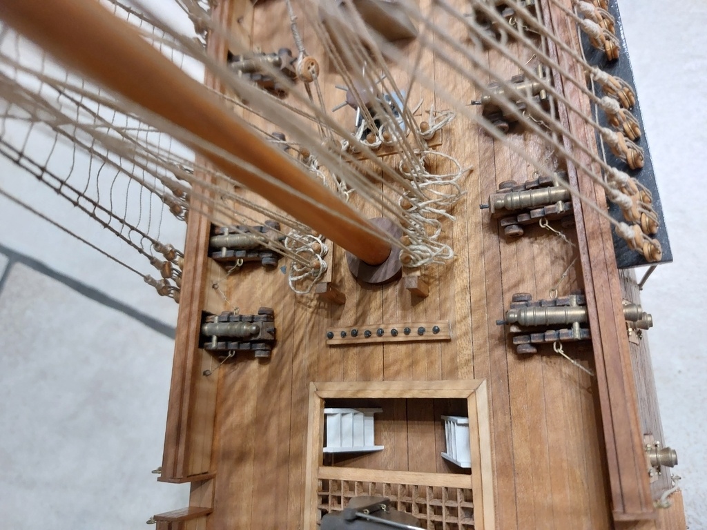 A l'époque j'ai uniquement acheté les plans, les canons en laiton, quelques pièces d'accastillage et un peu de bois en planches ou en baguettes. Il y a beaucoup de bois de récup, certaines pièces sont faites avec des fonds de boîtes à camembert , du CP de 3mm qu'il y avait sous les pizzas à l'époque, du câble en cuivre...