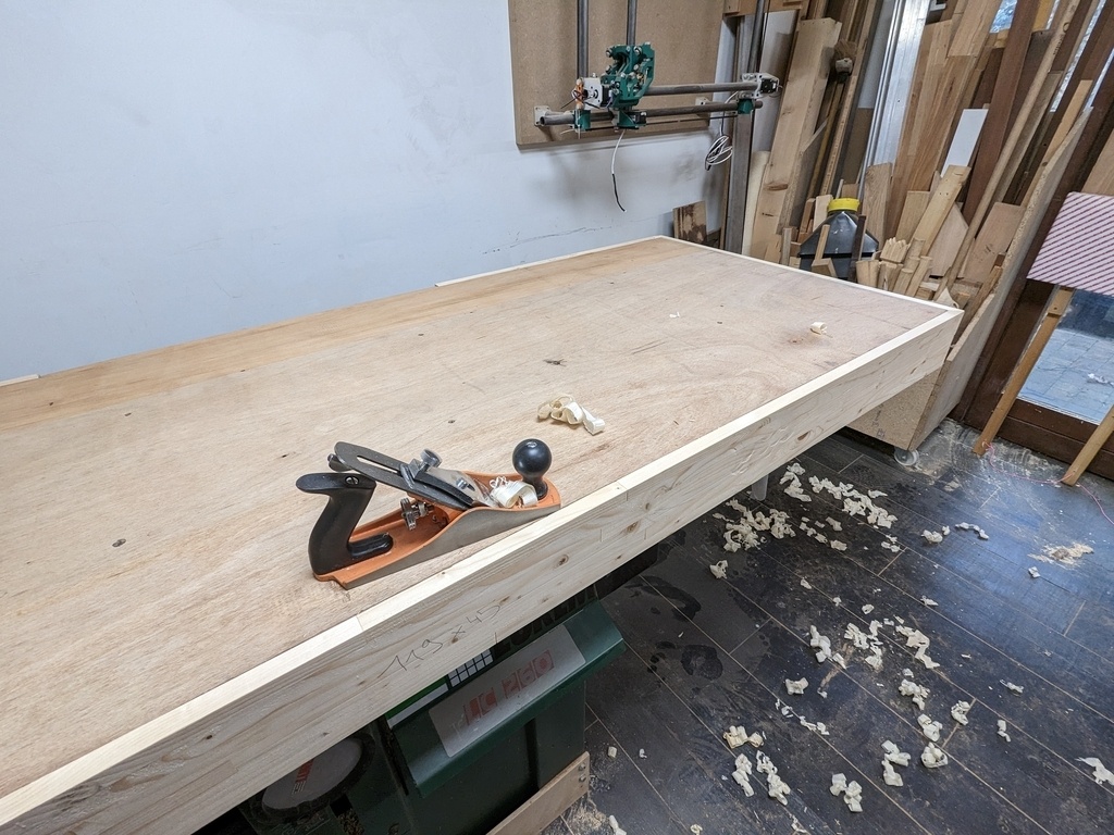 Pose du contreplaqué de surface (de la récup) 19mm. Et ajustement avec mon super rabot Magnusson.