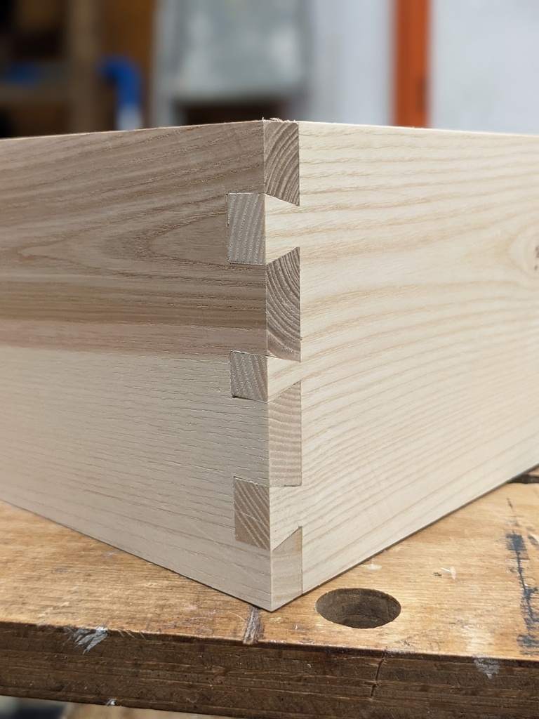 Les queues d'aronde ont été faites aux outils à main. Traçage avec une fausse équerre, au trusquin, crayon et couteau de marquage. Découpe à la scie japonaise et scie à chantourner (où au ciseau à bois directement) pour évider. Puis on fini les surfaces de contact aux ciseaux à bois proprement. Une fois la partie mâle réalisé, on reporte le tracé sur la partie femelle et on recommence les opérations.