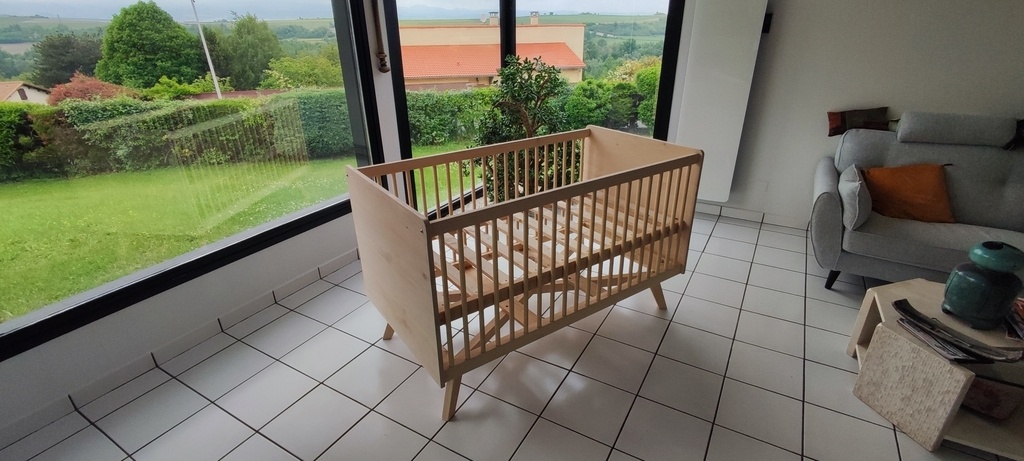 Notre première réalisation de menuiserie : un petit lit en tilleul avec plusieurs hauteurs possibles de sommier. Le tout convertible en lit pour enfant, sans barreau.